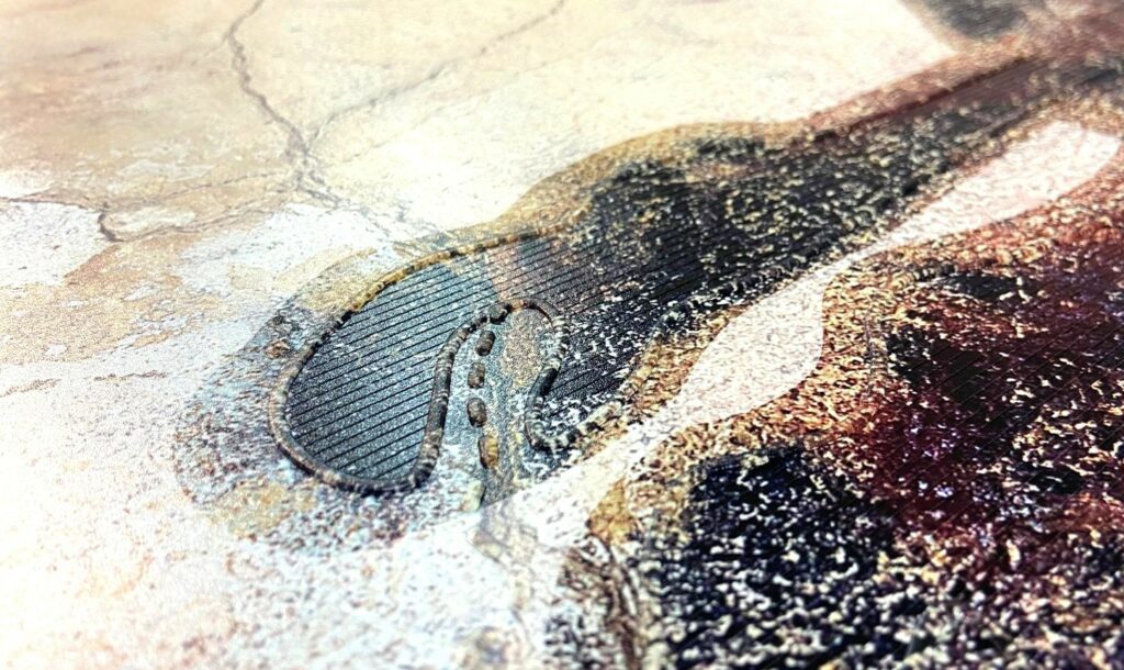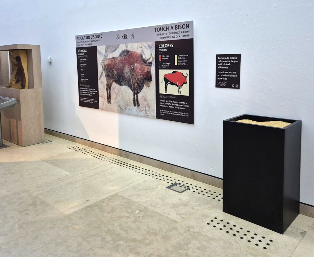 • El Gran Panel y la Peana: Imagina un soporte de 2.500 × 1.250 mm que explica, paso a paso, cómo pintaban en el Paleolítico. En una sección, una fotografía a gran escala del bisonte muestra las técnicas usadas, acompañada de su leyenda tanto en relieve como en visual. A su lado, una ilustración enseña los colores originales. Además, incluimos una peana con una reproducción de la piedra de la cueva para que notes la textura real del soporte original.