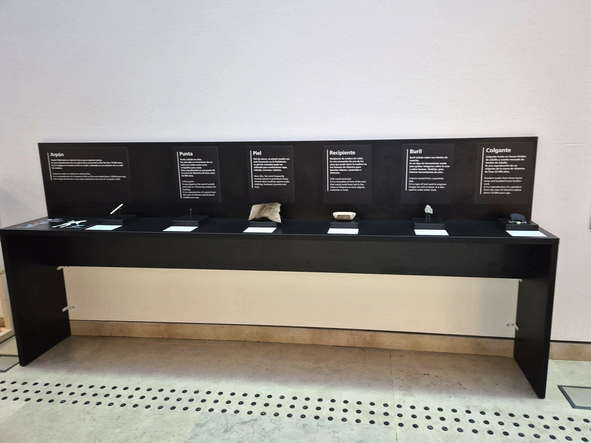 • La Mesa Interactiva: Es una estación de 2,8 metros de largo con seis reproducciones que invitan a ser exploradas. Cada una cuenta con su cartela en braille y textos en castellano e inglés. Por ejemplo, al tocar el arpón, un pequeño panel tacto-visual explica, con una ilustración, para qué servía exactamente hace miles de años.