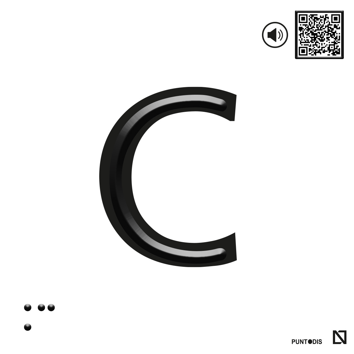 Placa con la letra C en braille y altorrelieve sobre aluminio con fondo gris o blanco. Este rótulo accesible tiene braille y altorrelieve centrado en el trazo, cumpliendo la legislación de la promoción de accesibilidad. Esta placa accesible es perfecta para la señalización de plantas y puertas en edificios, ascensores y otras aplicaciones similares.
