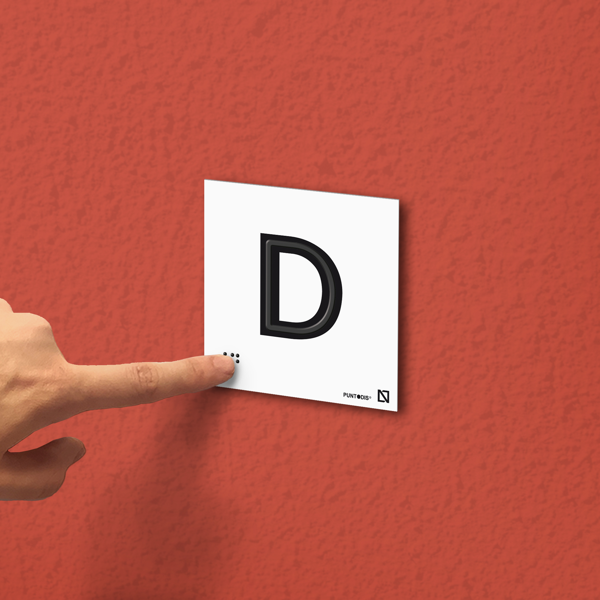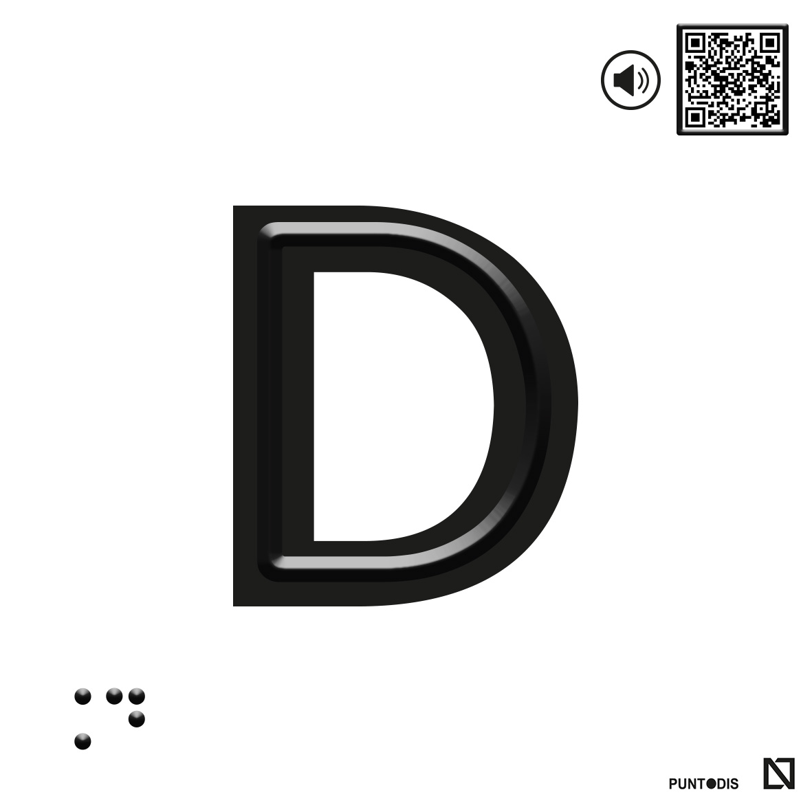 Placa con la letra D en braille y altorrelieve sobre aluminio con fondo gris o blanco. Este rótulo accesible tiene braille y altorrelieve centrado en el trazo, cumpliendo la legislación de la promoción de accesibilidad. Esta placa accesible es perfecta para la señalización de plantas y puertas en edificios, ascensores y otras aplicaciones similares.