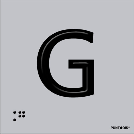 Placa con la letra G en braille y altorrelieve sobre aluminio con fondo gris o blanco.Este rótulo accesible tiene braille y altorrelieve centrado en el trazo, cumpliendo la legislación de la promoción de accesibilidad. Esta placa accesible es perfecta para la señalización de plantas y puertas en edificios, ascensores y otras aplicaciones similares.