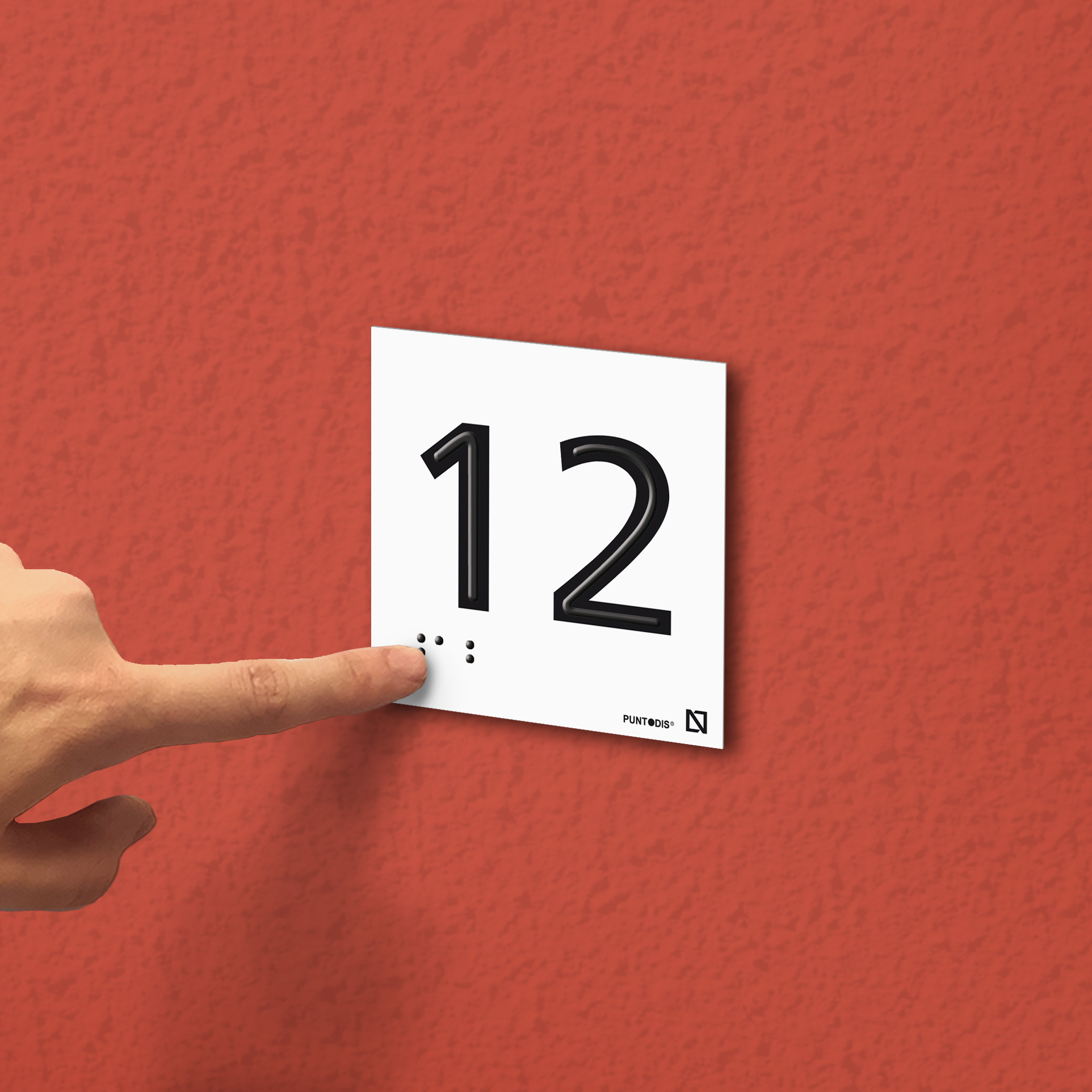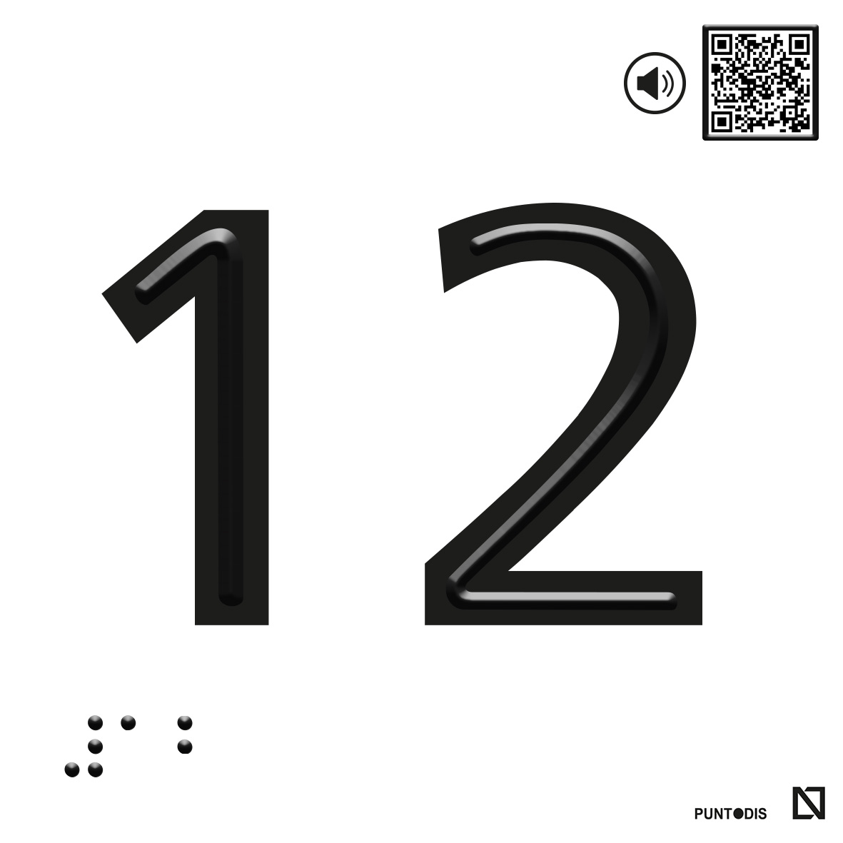 Placa con el número 12 en braille y altorrelieve en aluminio con fondo gris o blanco.Este rótulo accesible tiene braille y altorrelieve centrado en el trazo, cumpliendo la legislación de la promoción de accesibilidad. Esta placa accesible es perfecta para la señalización de plantas y puertas en edificios, ascensores y otras aplicaciones similares.