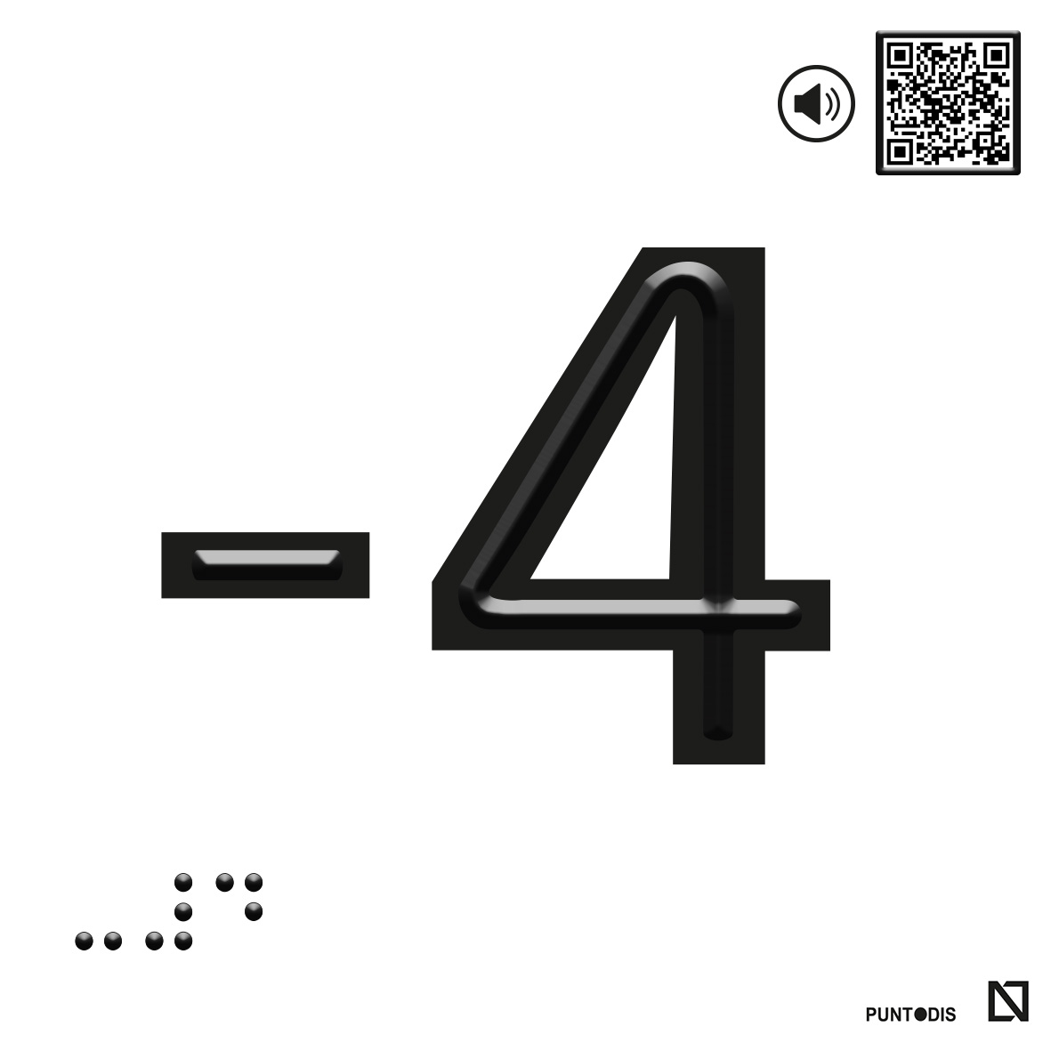 Placa con el número -4 en braille y altorrelieve. Este rótulo accesible tiene braille y altorrelieve centrado en el trazo, cumpliendo la legislación de la promoción de accesibilidad. Esta placa accesible es perfecta para la señalización de plantas y puertas en edificios, ascensores y otras aplicaciones similares.