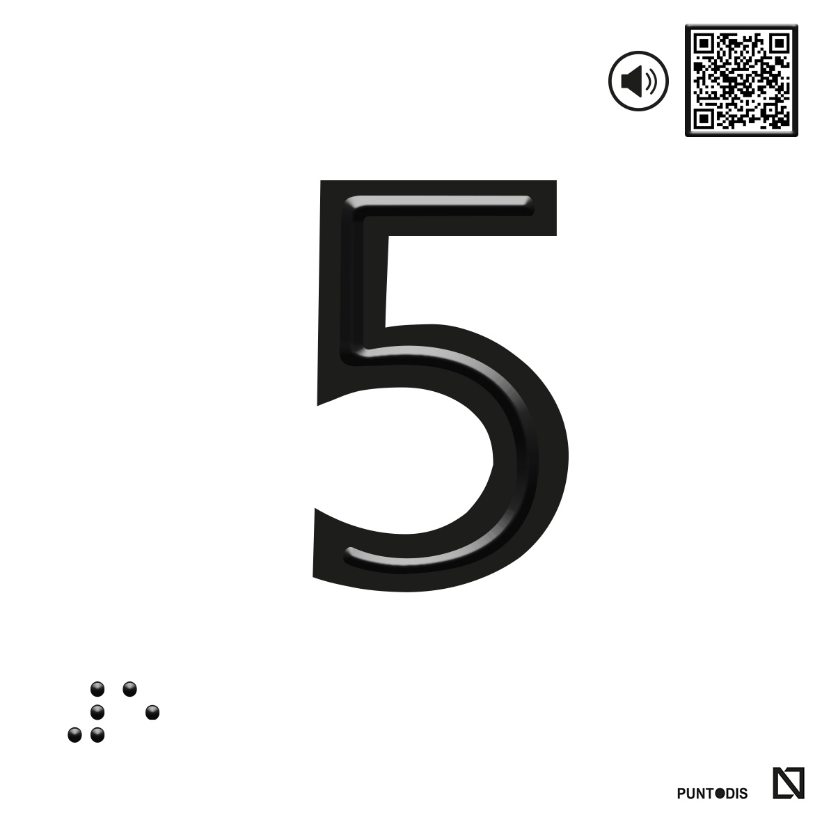 Placa con el número 5 en braille y altorrelieve en aluminio con fondo gris o blanco. Este rótulo accesible tiene braille y altorrelieve centrado en el trazo, cumpliendo la legislación de la promoción de accesibilidad. Esta placa accesible es perfecta para la señalización de plantas y puertas en edificios, ascensores y otras aplicaciones similares.