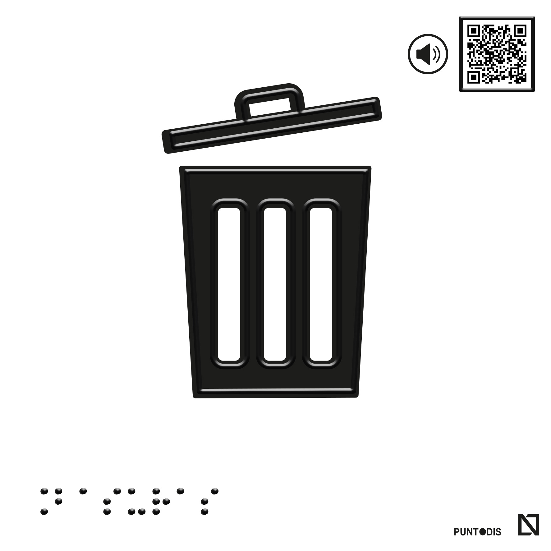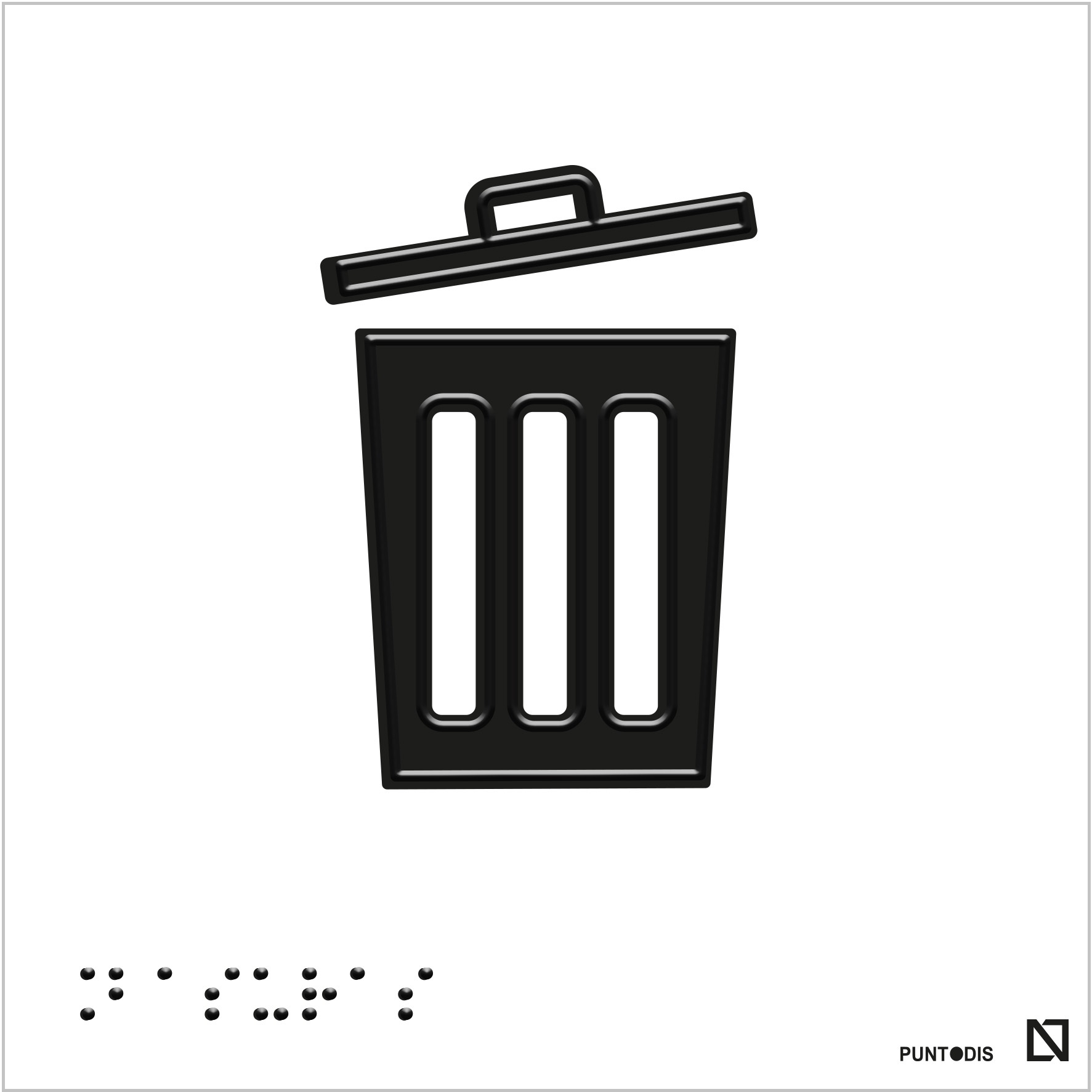 Placa con pictograma para identificar las zonas comunes en edificación de basuras, tiene el texto en braille y el pictograma tiene altorrelieve centrado en el trazo. El pictograma está diseñado según pautas de diseño para TODAS LAS PERSONAS.