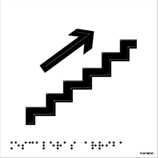 Placa con pictograma de escaleras hacía arriba en braille y altorrelieve en aluminio con el fondo en diferentes colores. Este rótulo accesible tiene braille y altorrelieve centrado en el trazo, cumpliendo la legislación de la promoción de accesibilidad. Esta placa accesible es perfecta para señalizar todo tipo de entornos de manera accesible. El pictograma está diseñado según pautas de diseño para TODAS LAS PERSONAS.