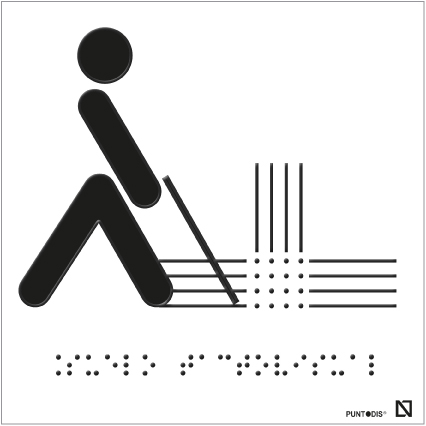 Pictograma que indica que en ese lugar hay Suelo tactovisual, con altorrelieve y braille que ayuda a su percepción por personas invidentes o con baja visión.